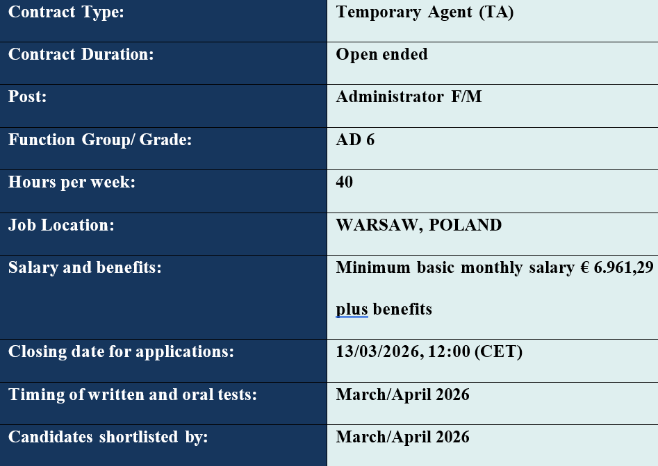 The Selection Board will establish a list of suitable candidates from amongst those who have obtained at least 60% of the points for the whole of the tests (written and oral combined) and have obtained the minimum mark required for each of them. The 3 best-scored candidates shall be shortlisted in order of merit. Inclusion of a candidate’s name on the list of suitable candidates does not constitute either a right to, or a guarantee of recruitment.