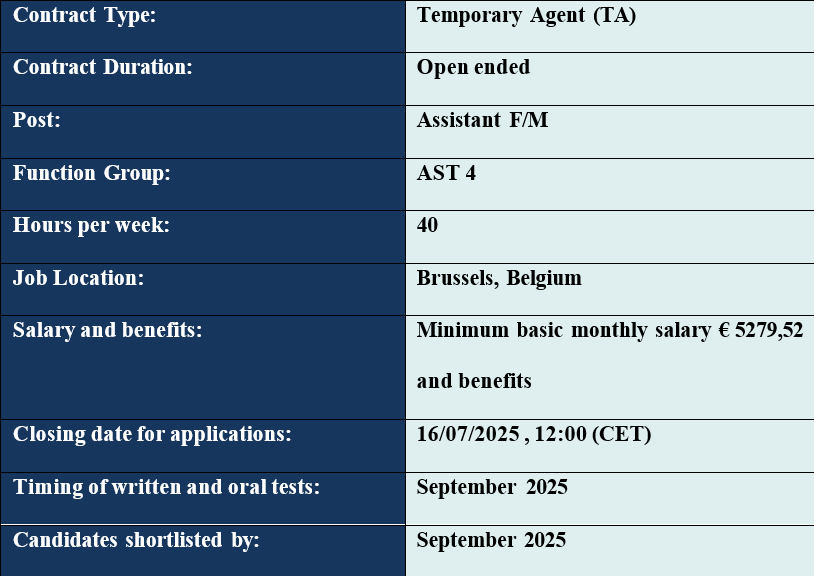 Candidates included on the list of suitable candidates will be eligible to be recruited as the need arises in the ESN Group. Recruitment will be at grade AST 4 and one post is to be filled in. The list of suitable candidates will have an initial validity of two years. It can be extended. If so, the candidates on the list will be duly informed. Short-listed candidates who are offered a job will in due course be required to produce the originals of their diploma(s), degree(s) and employment certificates for verification.