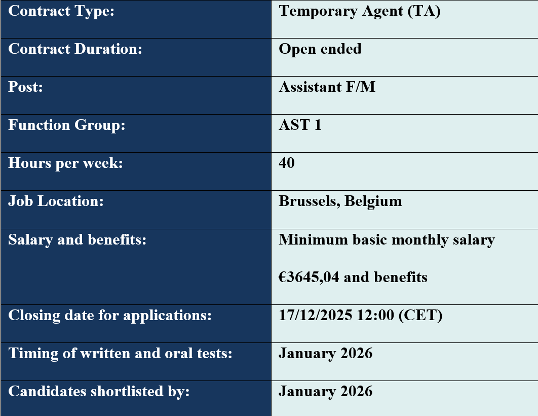 Candidates included on the list of suitable candidates will be eligible to be recruited as the need arises in the ESN Group. Recruitment will be at grade AST 1 and one post is to be filled in. The list of suitable candidates will have an initial validity of two years. It can be extended. If so, the candidates on the list will be duly informed. Short-listed candidates who are offered a job will in due course be required to produce the originals of their diploma(s), degree(s) and employment certificates for verification.